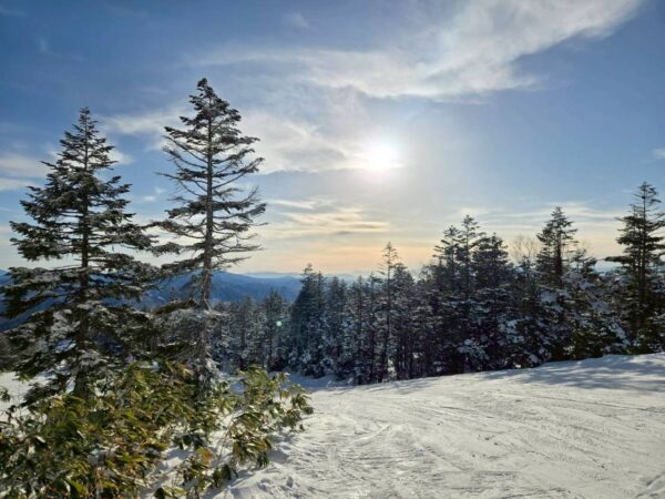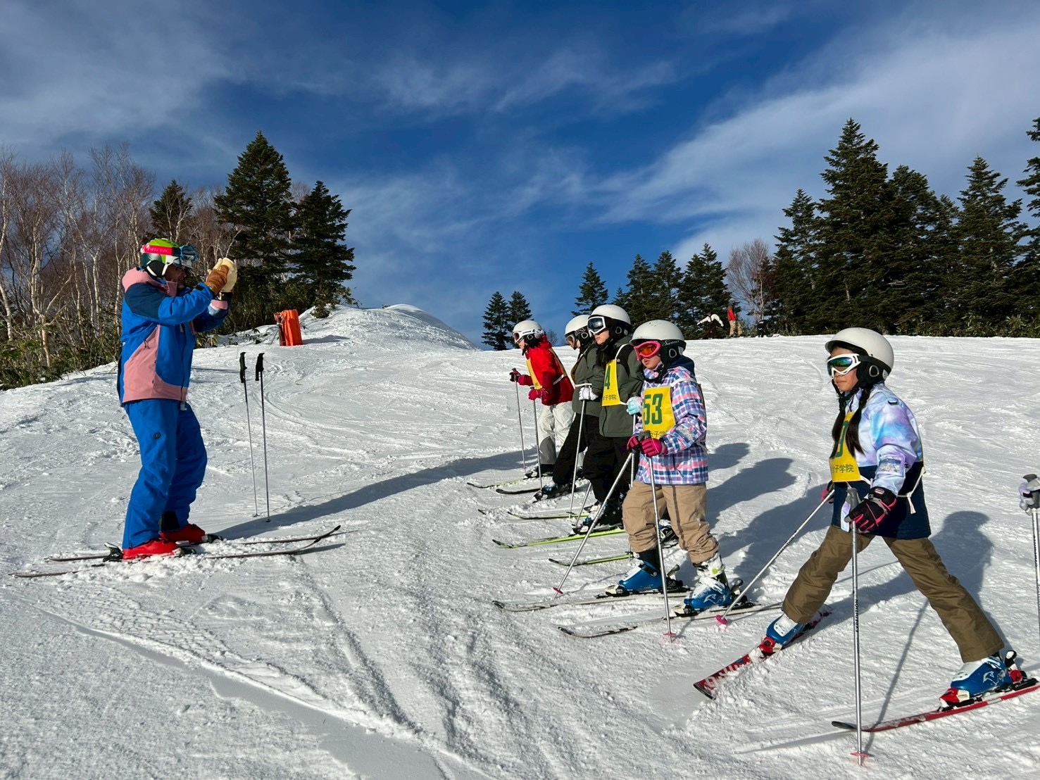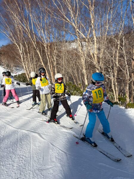 1〜4班は、朝イチでゴンドラに乗って、標高2000mの焼額山山頂へ。素晴らしい景色と真っ白な雪、真っ青な空の中、気持ちよく滑走していました。