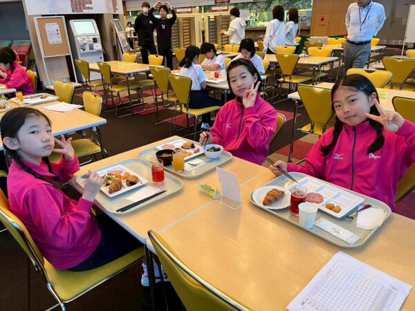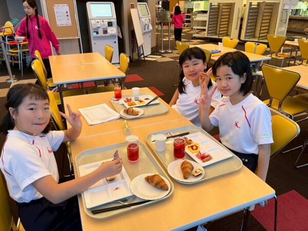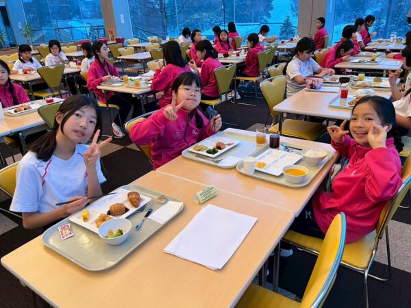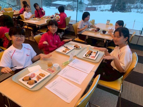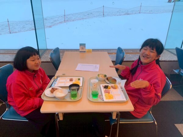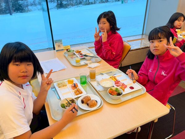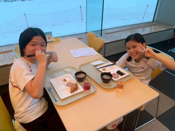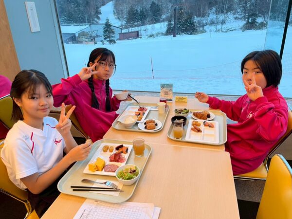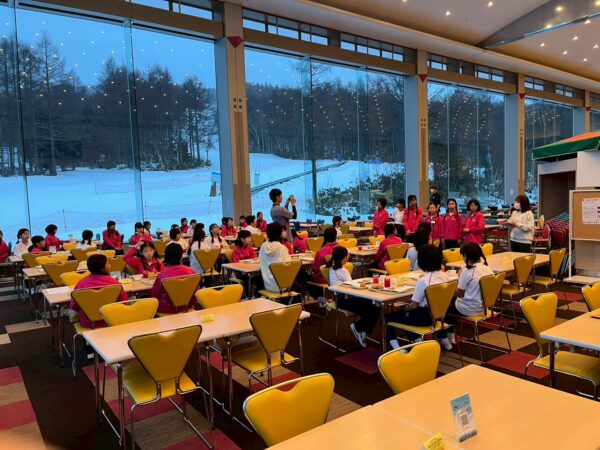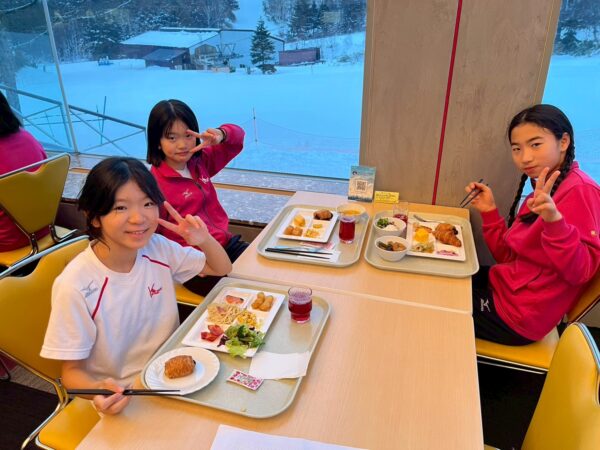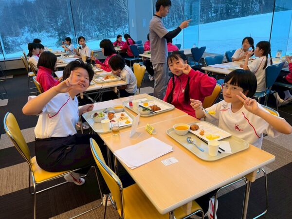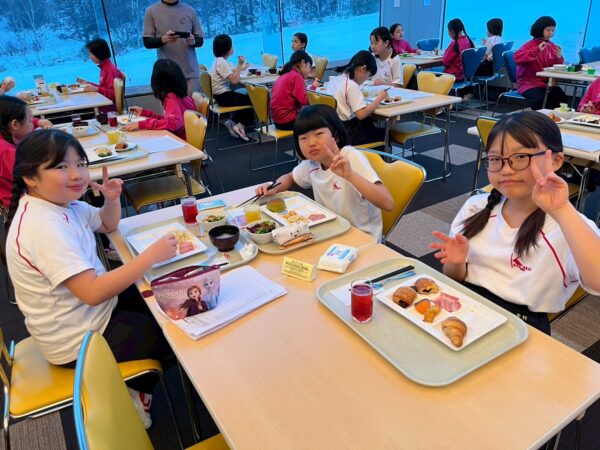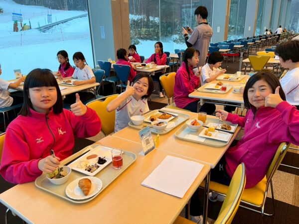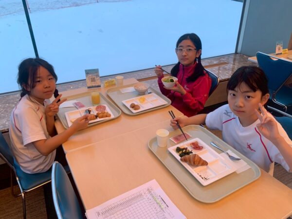 スキー学校最終日、今日は朝から雪が舞っています。子供たちは、みんな元気に起きて、今日の練習に備え、モリモリ朝食を食べました。