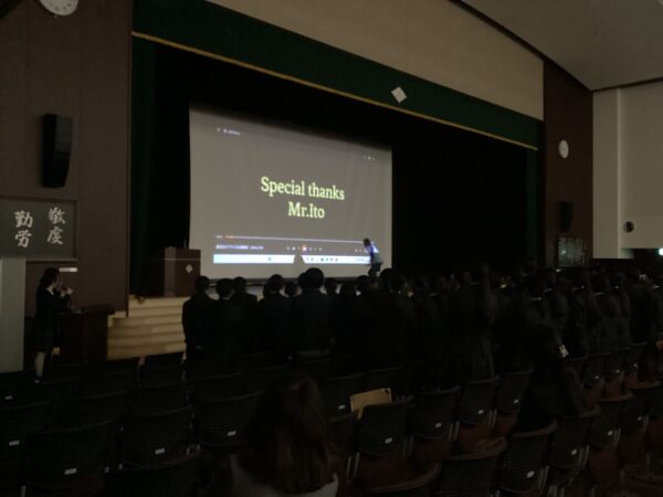 講演の最後には、伊藤先生が大切にされている曲である Oasis の「Whatever」に合わせ、クラスごとに感謝のメッセージを送るサプライズ企画を実施。会場は温かな手拍子に包まれ、講演中は和やかな雰囲気の中で幕を閉じました。私たち白菊会をはじめ、生徒の皆さんにとっても、多くの学びを得る貴重な時間となり、将来に向けて数多くのヒントをいただく機会になったと思います。