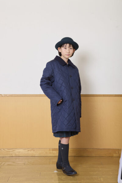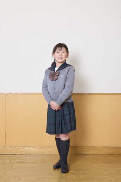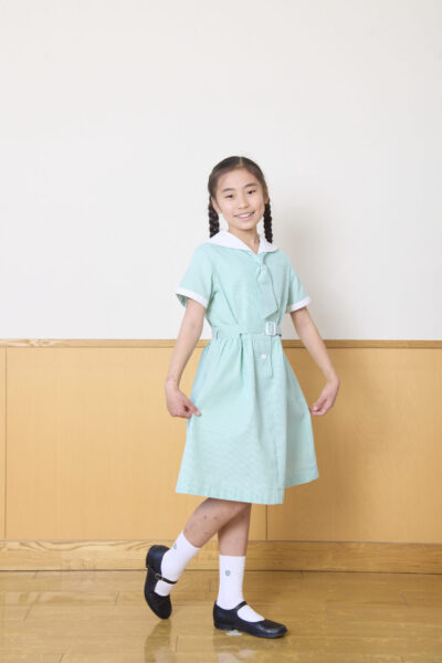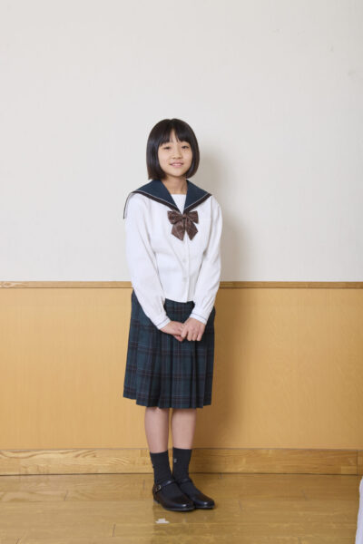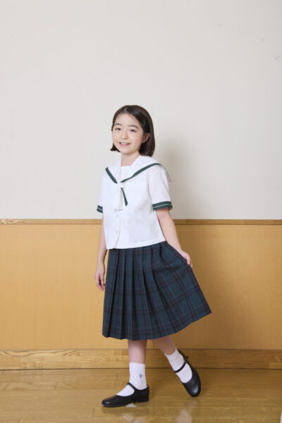 襟やリボンに今までのセーラー服の面影を残しながら、イートン着用、スカートはグリーンを基調にしたチェックのスタイルです。
