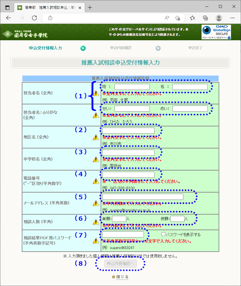 事前申込の際には、受験希望生徒の個人情報・学業成績等を入力することはありません。これらの情報は入試相談票にご記入の上、郵送してください。 |